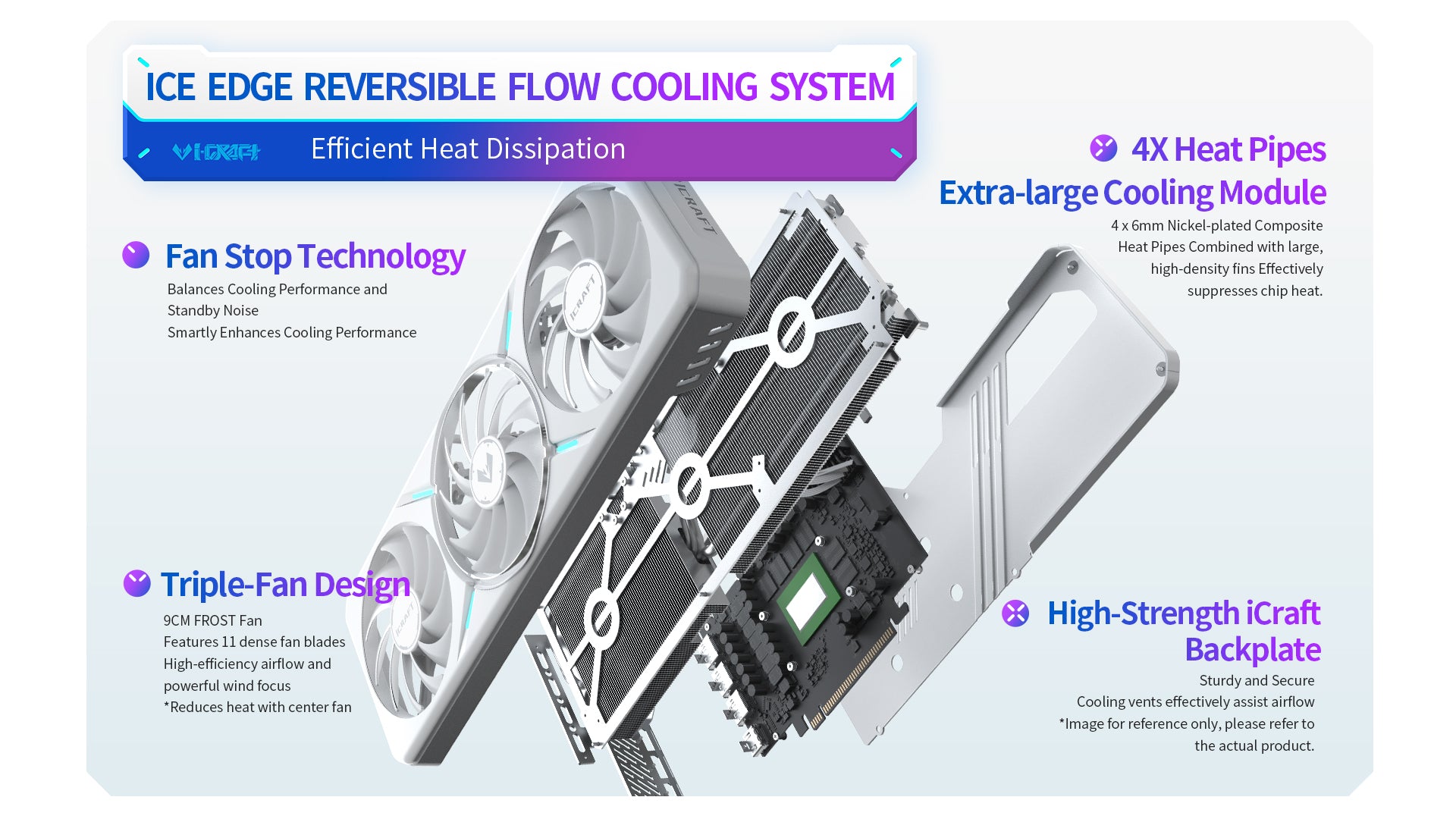 Cooling and Noise: MAXSUN hasn't skimped on cooling, employing the Ice-Edge Bidirectional Cooling System with three 9cm FROST fans. This setup ensures that even under heavy load, the card remains cool, maintaining performance without thermal throttling. Noise levels are kept to a minimum, which is a significant advantage for those sensitive to fan noise during long gaming or rendering sessions.